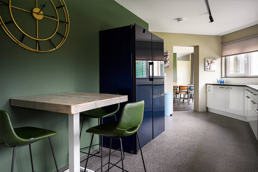 Centraal in het huis een moderne royale keuken gesitueerd met uitzicht over de grote tuin, eigen haven en terras. De keuken is compleet uitgerust met 6 pits-gastoestel, 2 vaatwassers, dubbele koelkast en vrieskast, diverse koffiezetapparaten (Nespresso, Senseo en koffiefilterapparaat), uitgebreide keukeninventaris en apparatuur. Bartafel met 3 krukken.