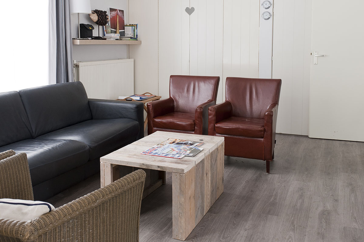 Aan de ene kant van het huis is een woonkamer met sfeervolle eigentijdse, nautische inrichting, comfortabel meubilair met o.a. lederen banken, Led TV met Ziggo signaal, nautische boeken en tijdschriften.