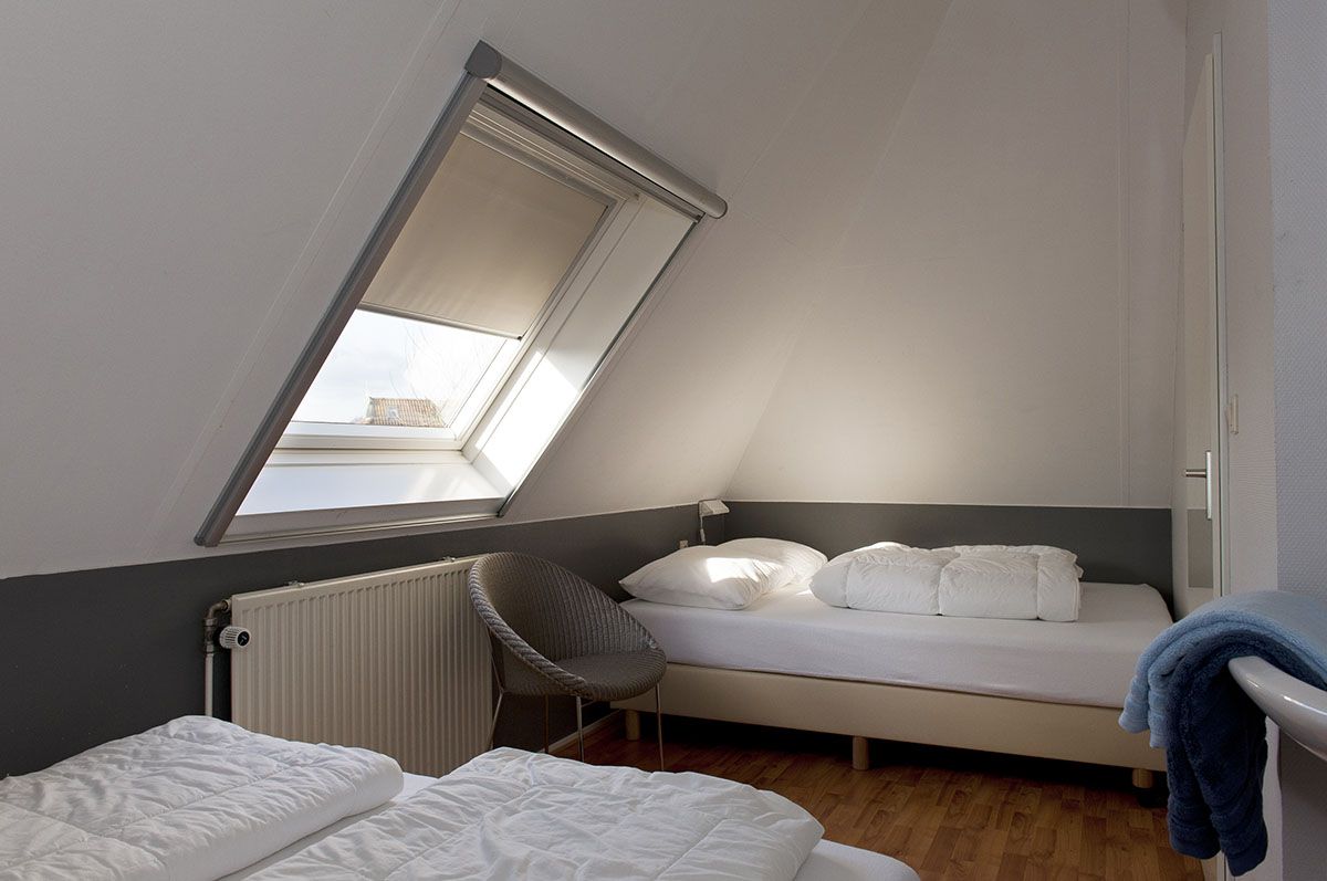 Twee driepersoons slaapkamers met drie éénpersoons boxspringbedden